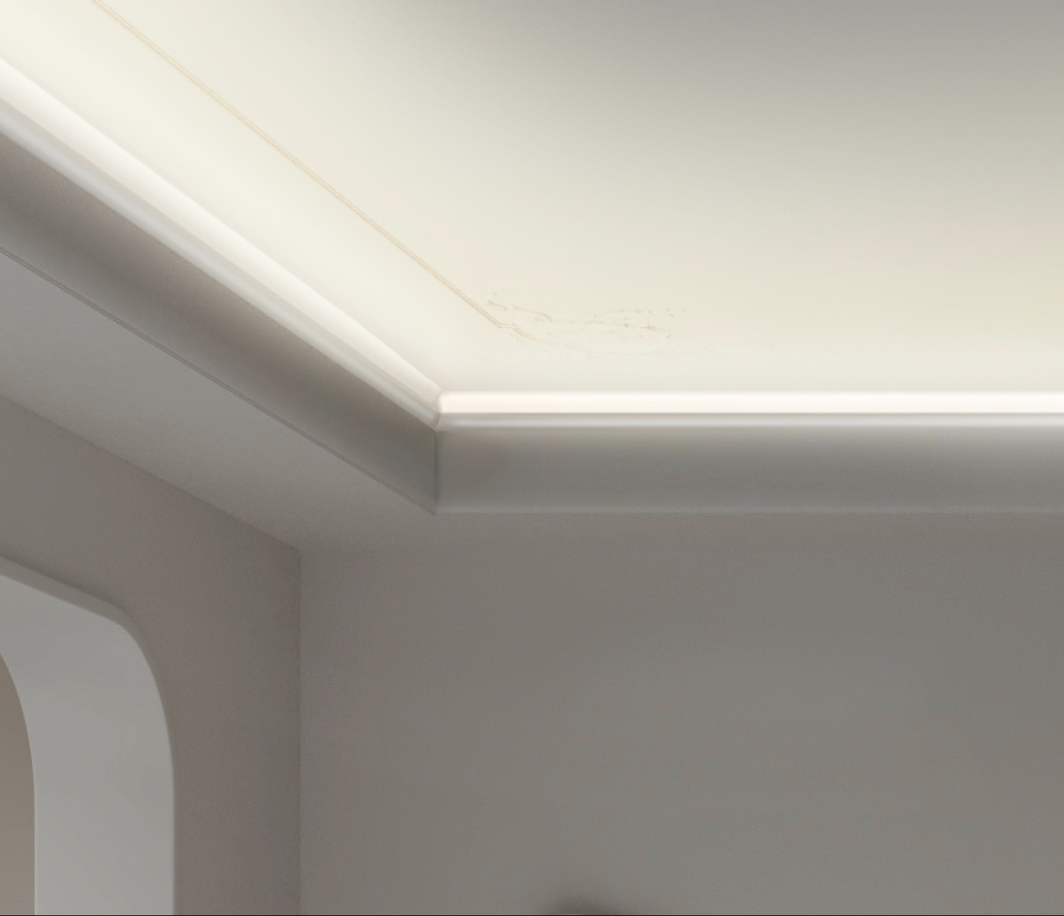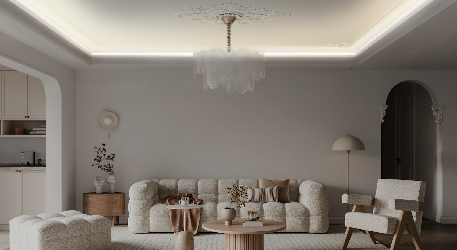 Perifina Cornice 4 in. creates a soft, indirect glow around the edges of the ceiling in this modern living room. The diffused illumination enhances the calm and serene ambiance by adding depth and dimension to the space.