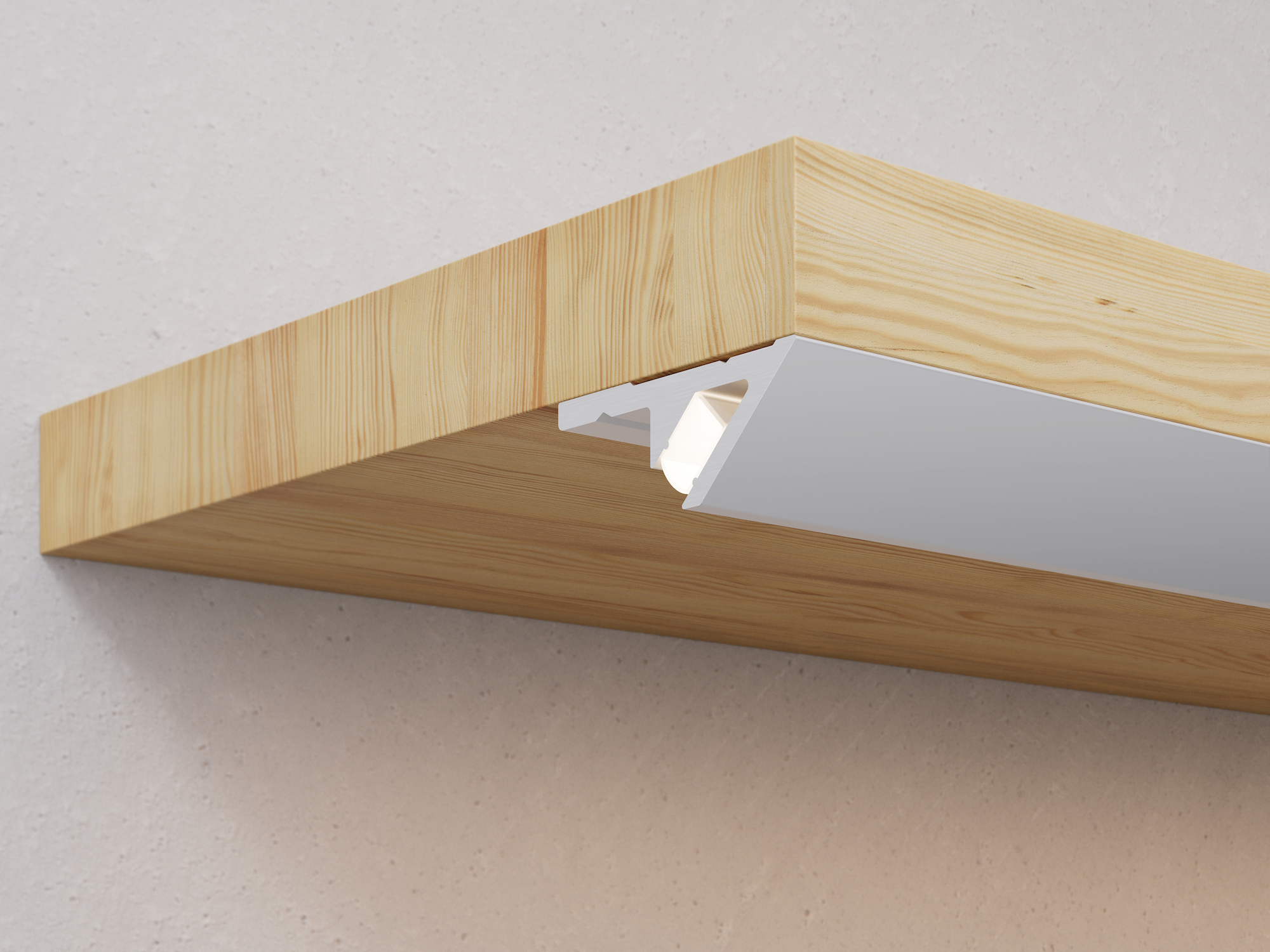 The front lip sits flush with the shelf’s edge, and its angled profile subtly conceals the channel from view