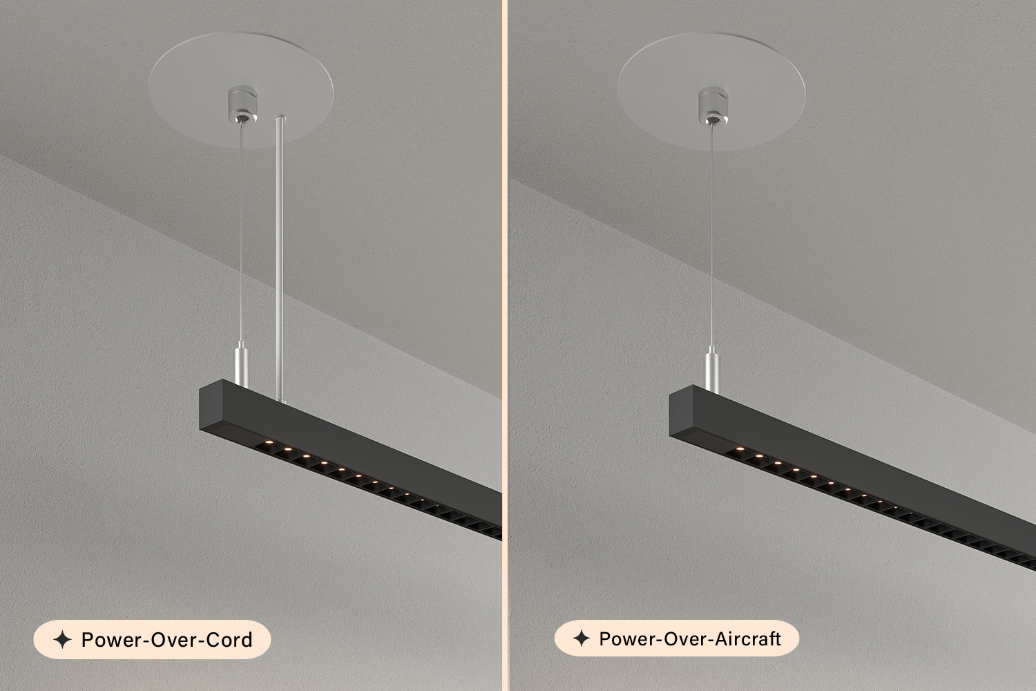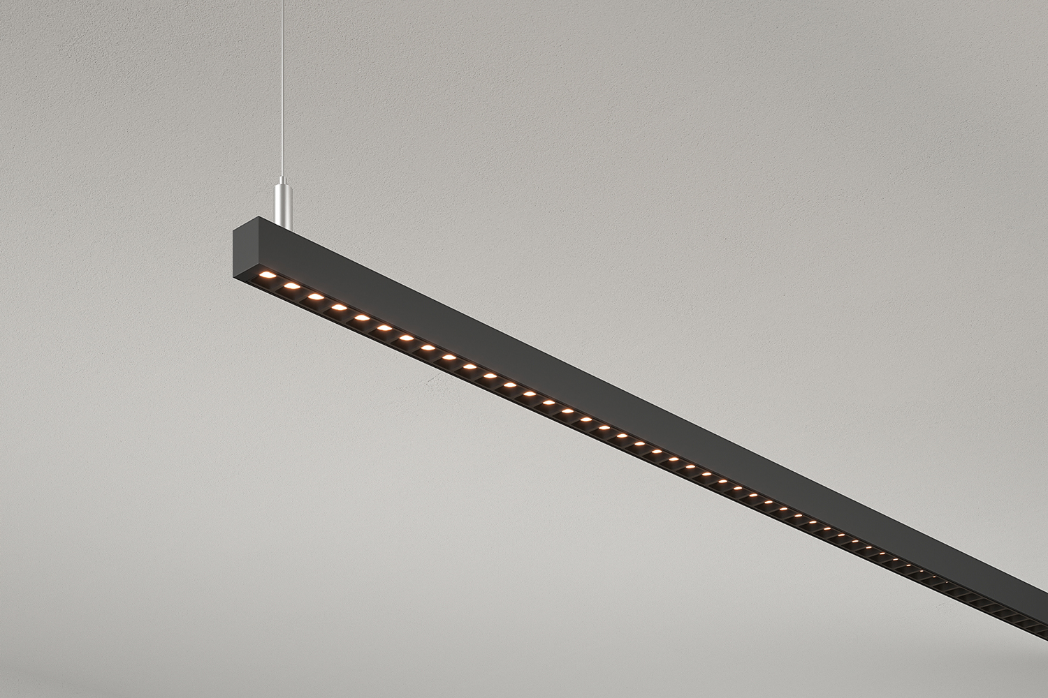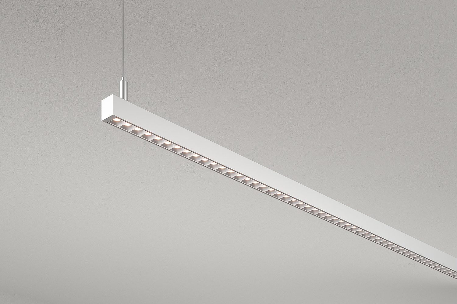 Suspended linear luminaire delivering uniform, low-glare illumination with discreet power-over-cord or power-over-aircraft-cable options for a streamlined look.